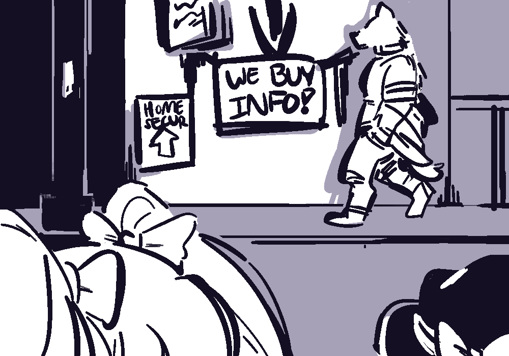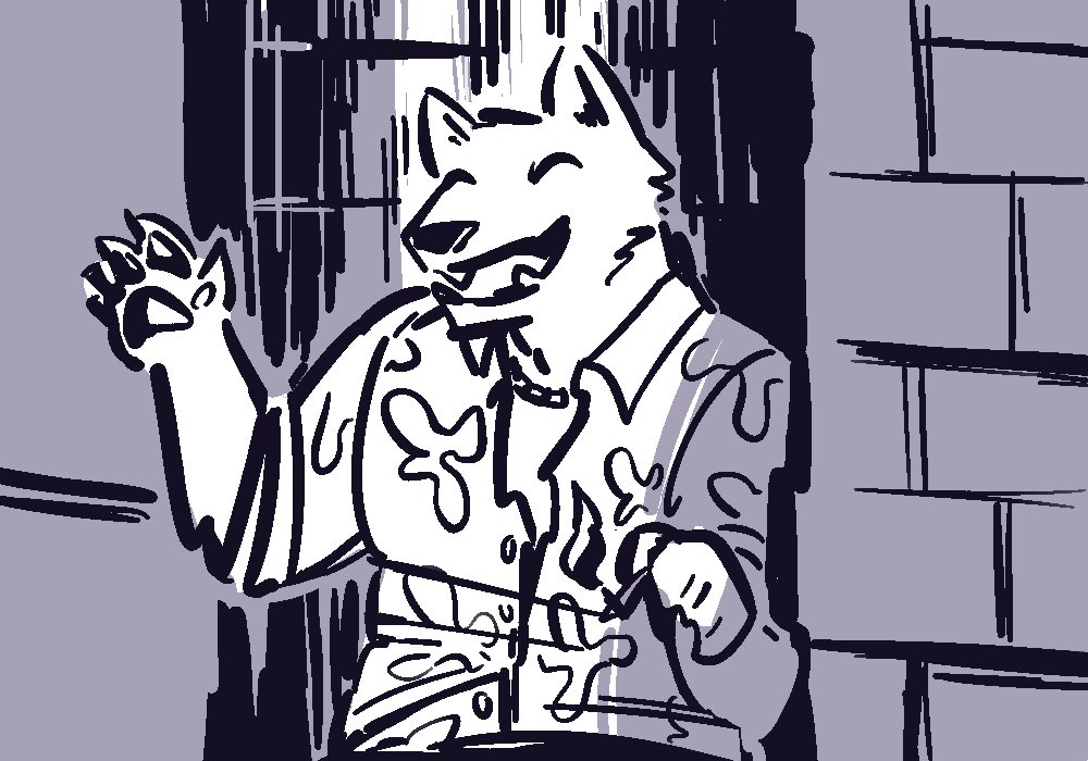 "Hey, hey, Violet of the hour. Watcha' doing out on the town? You want a hit?" he waves the blunt in front of him and invites you to join him in the alley. You spot a few other wolves over his shoulder playing a game of blackjack.