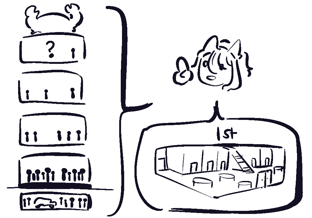 Half your fries are gone by the time Eiko answers and you squint at her, "It used to be an office building. About four floors with the crab on top. He usually isn't in the crab, but his office is in the very top floor."